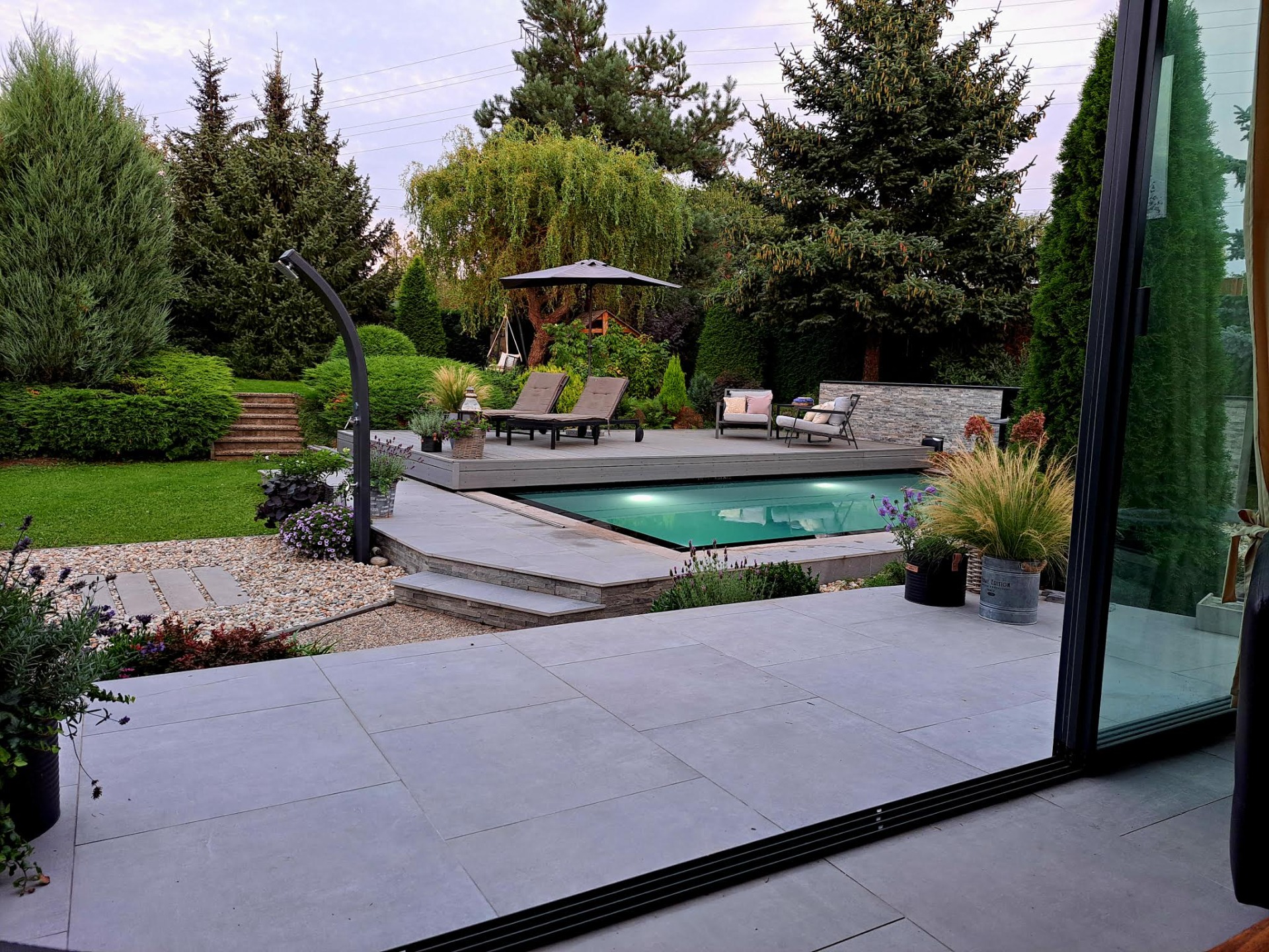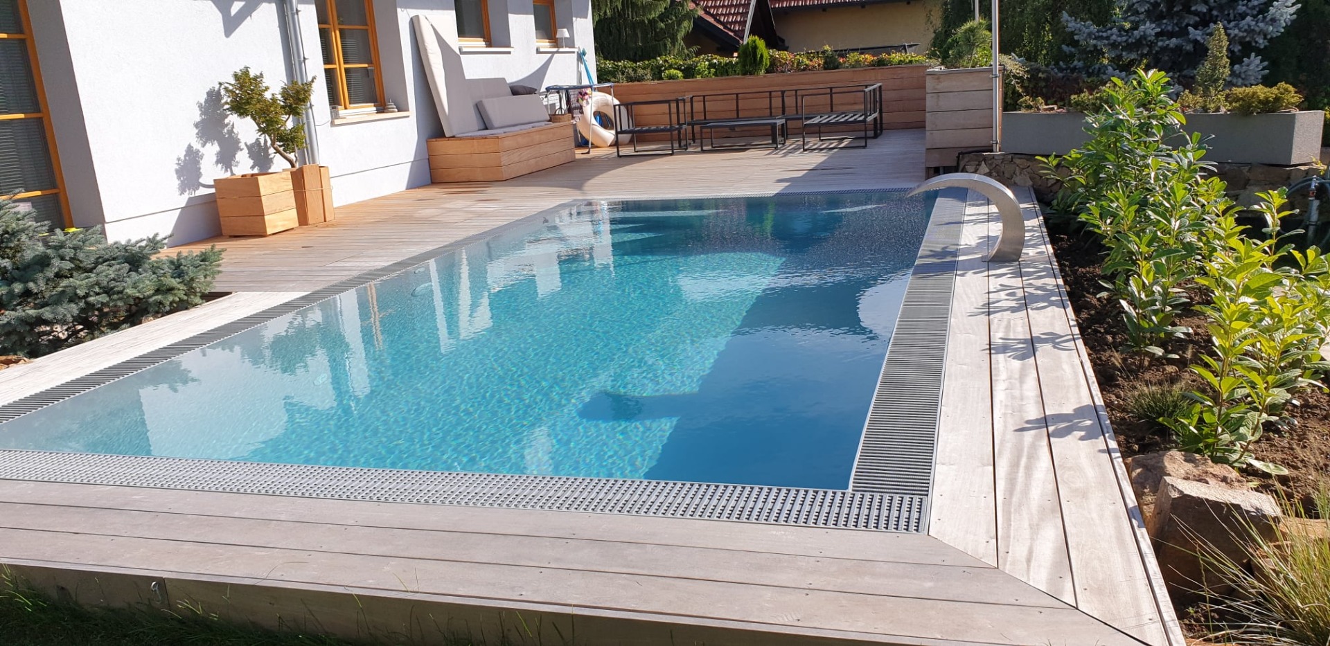 Na bazén byla instalována automatická pojízdná terasa s WPC obkladem typu šedý kámen. Pojezd je realizován do dlouhé strany na dálkové ovládání v telefonu. Terasa designovaná jako relaxační zóna. Nachází se na ni lehátka a křesla. Nerezové kolejnice jsou umístěny nad terénem.