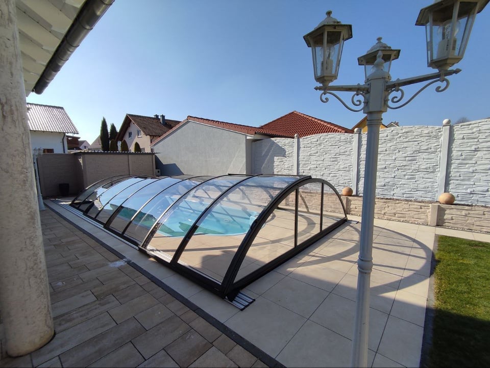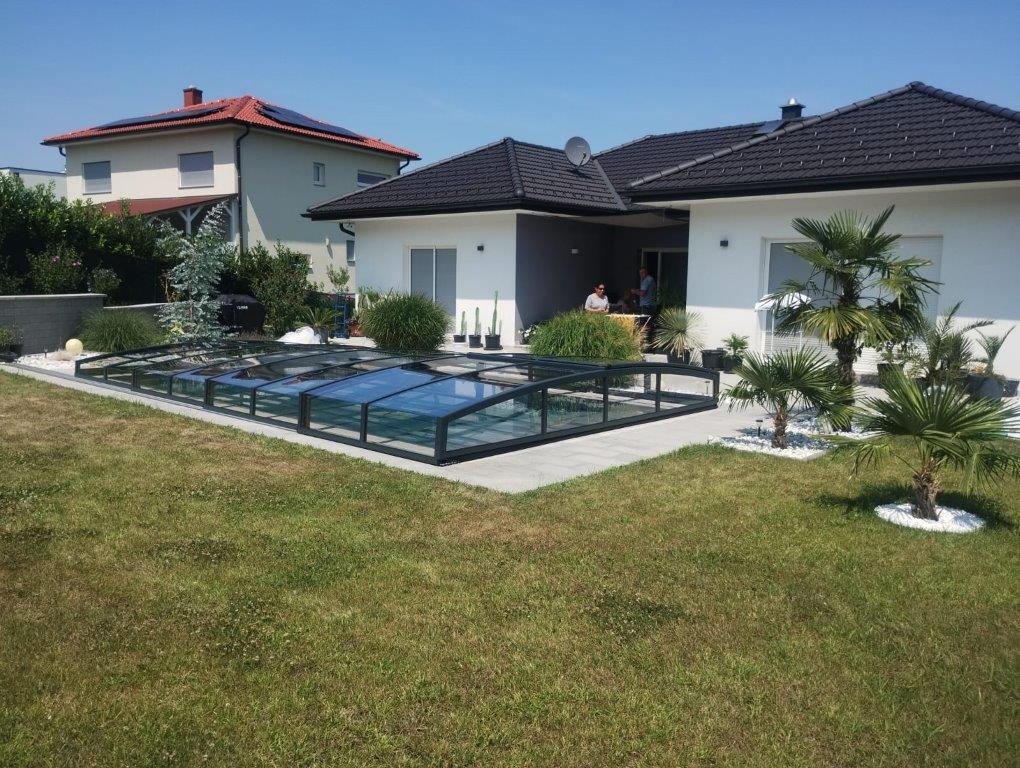 Nízké čtyřsegmentové zastřešení antracitové konstrukce bylo realizováno v rakouském Innsbrucku. Zákazník si zvolil dvoukolejnicový systém s dvojitou aretací. Důvodem je častý výskyt větru o vyšších rychlostech. Vstup do bazénu tvoří jedny posuvné dveře s uzamykáním na klíč. Výplň tvoří čirý polykarbonát síly 4 mm.