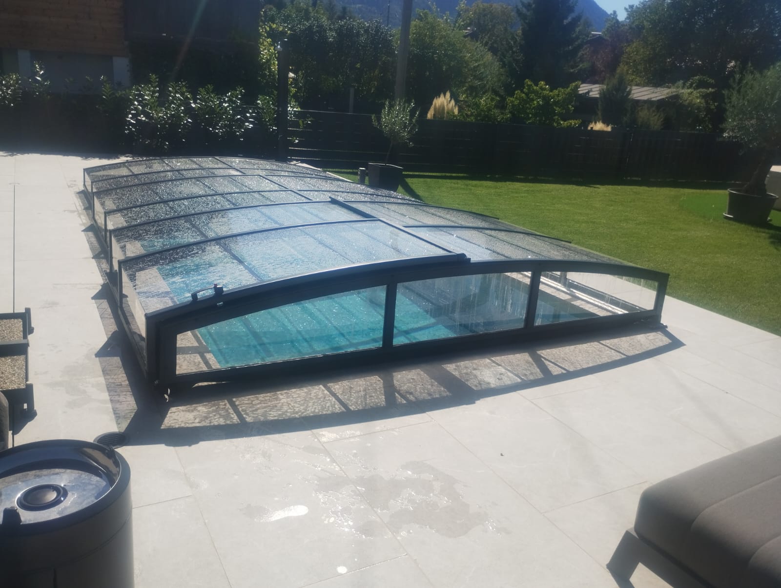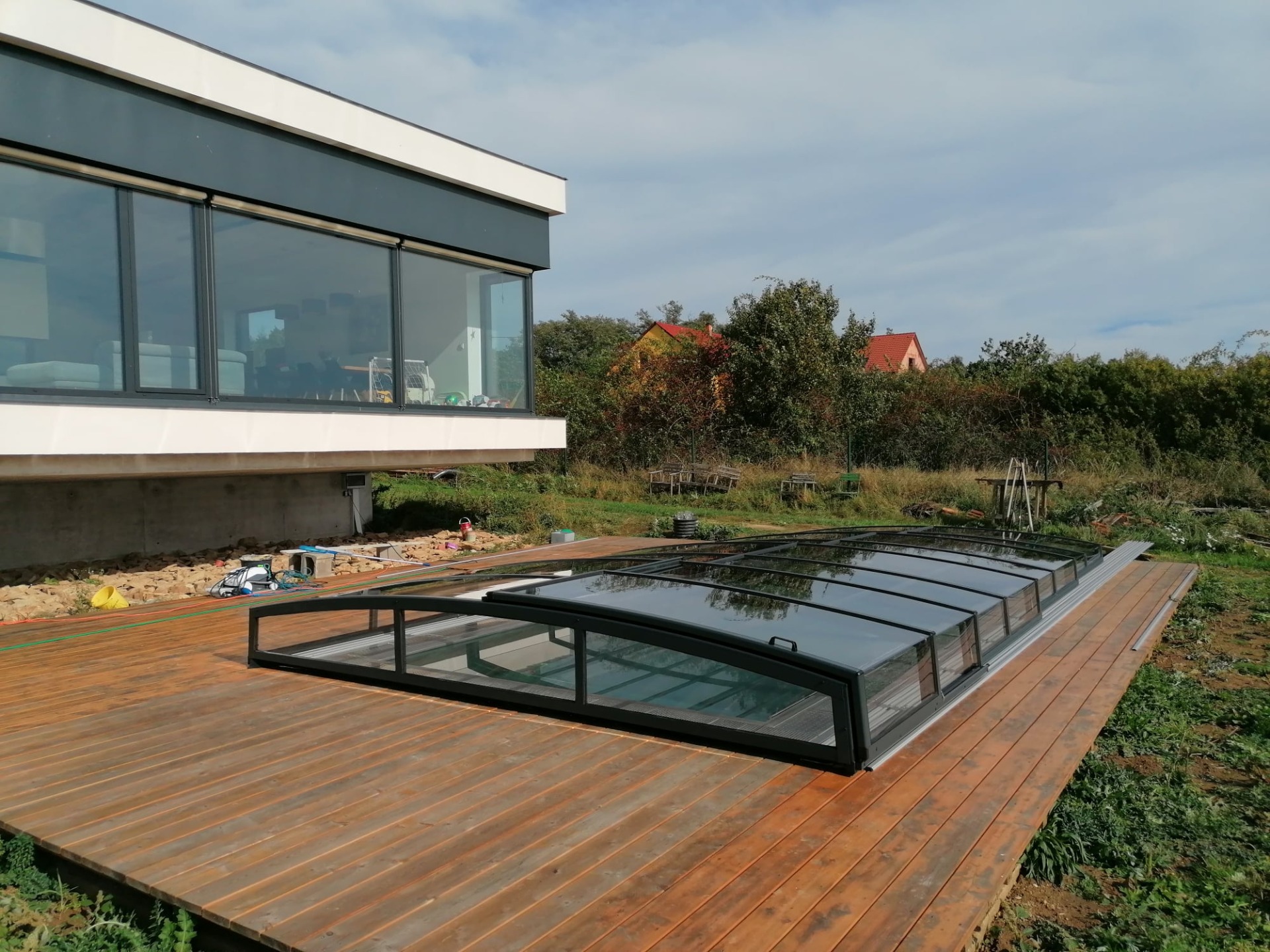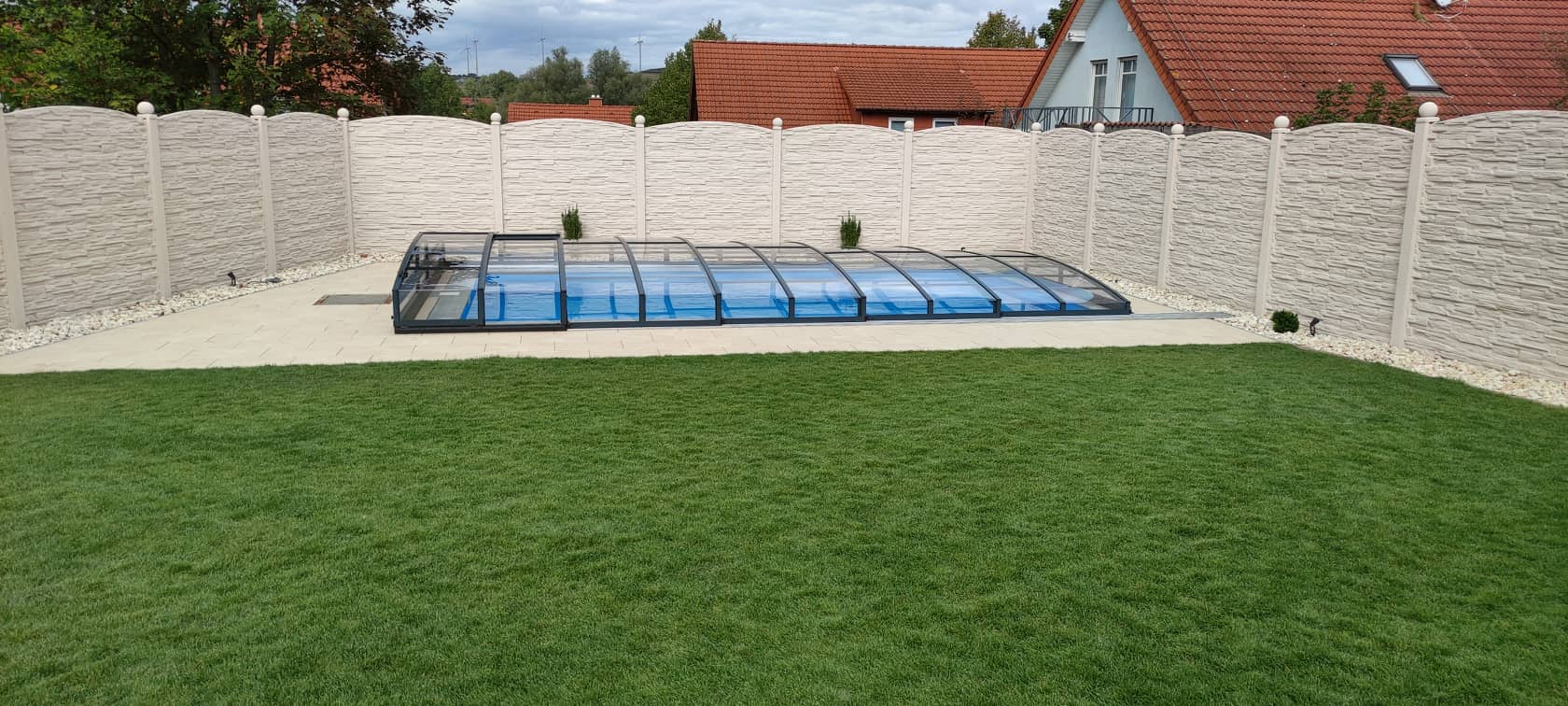 Po pokládce bylo instalováno nízké zastřešení NIECA s uzamykatelnými posuvnými dveřmi v nejvyšším segmentu. Na zadním čele bylo nutné udělat sklopný profil z důvodu požadavku na přejezd ventilačních hlavic a revizního otvoru. Jednokolejnicový systém s povrchovou instalací ližiny umožňuje pohodlný vstup do bazénu.