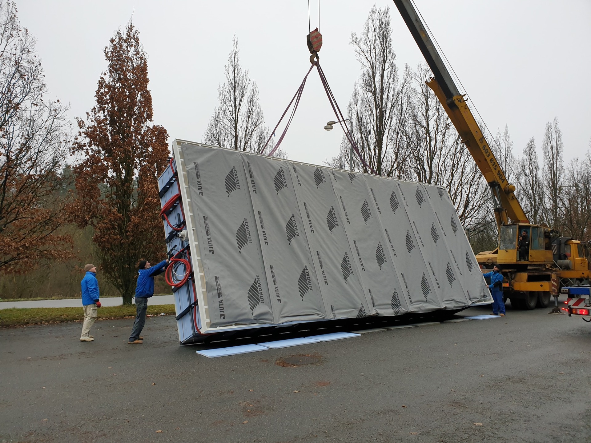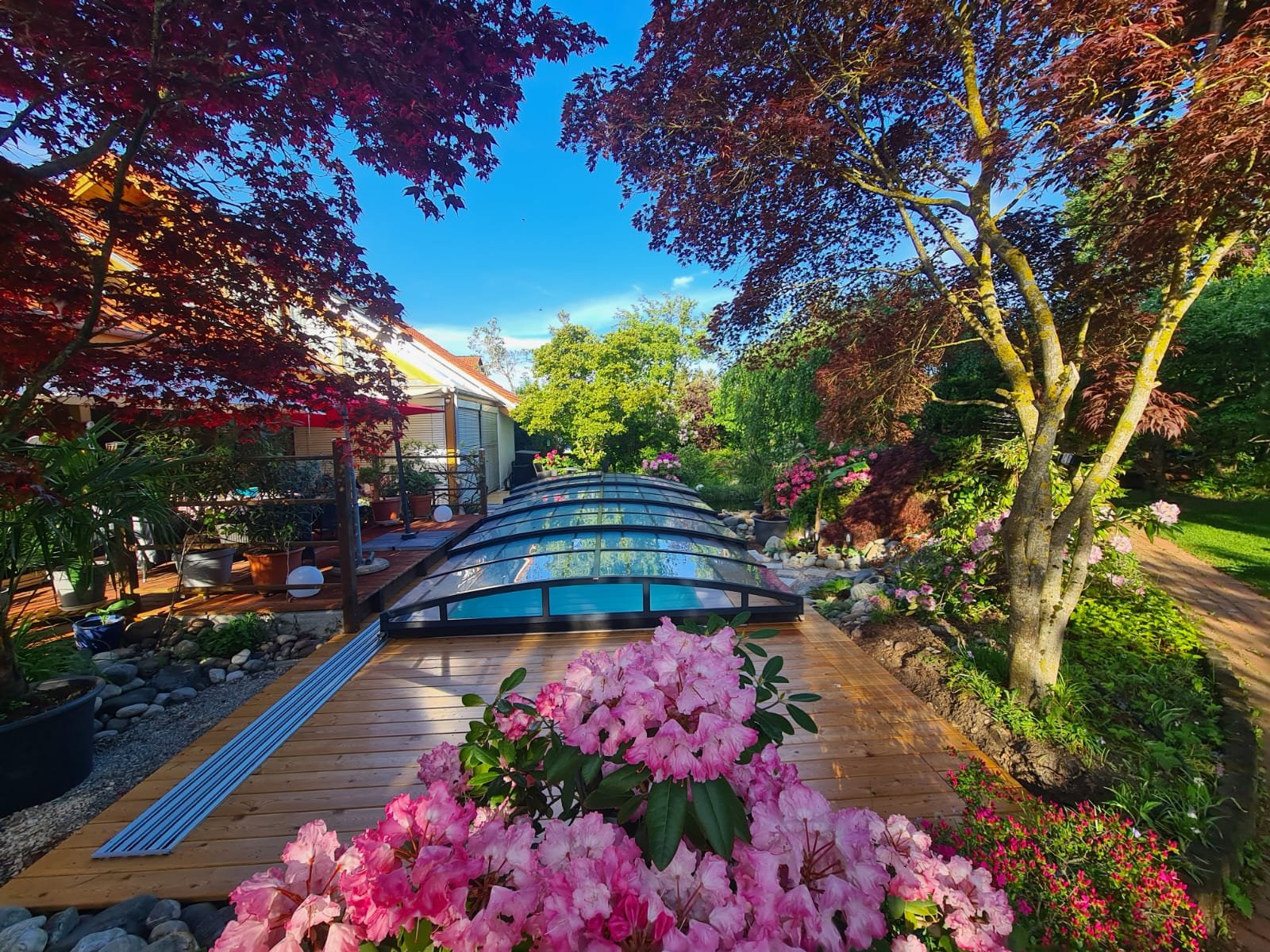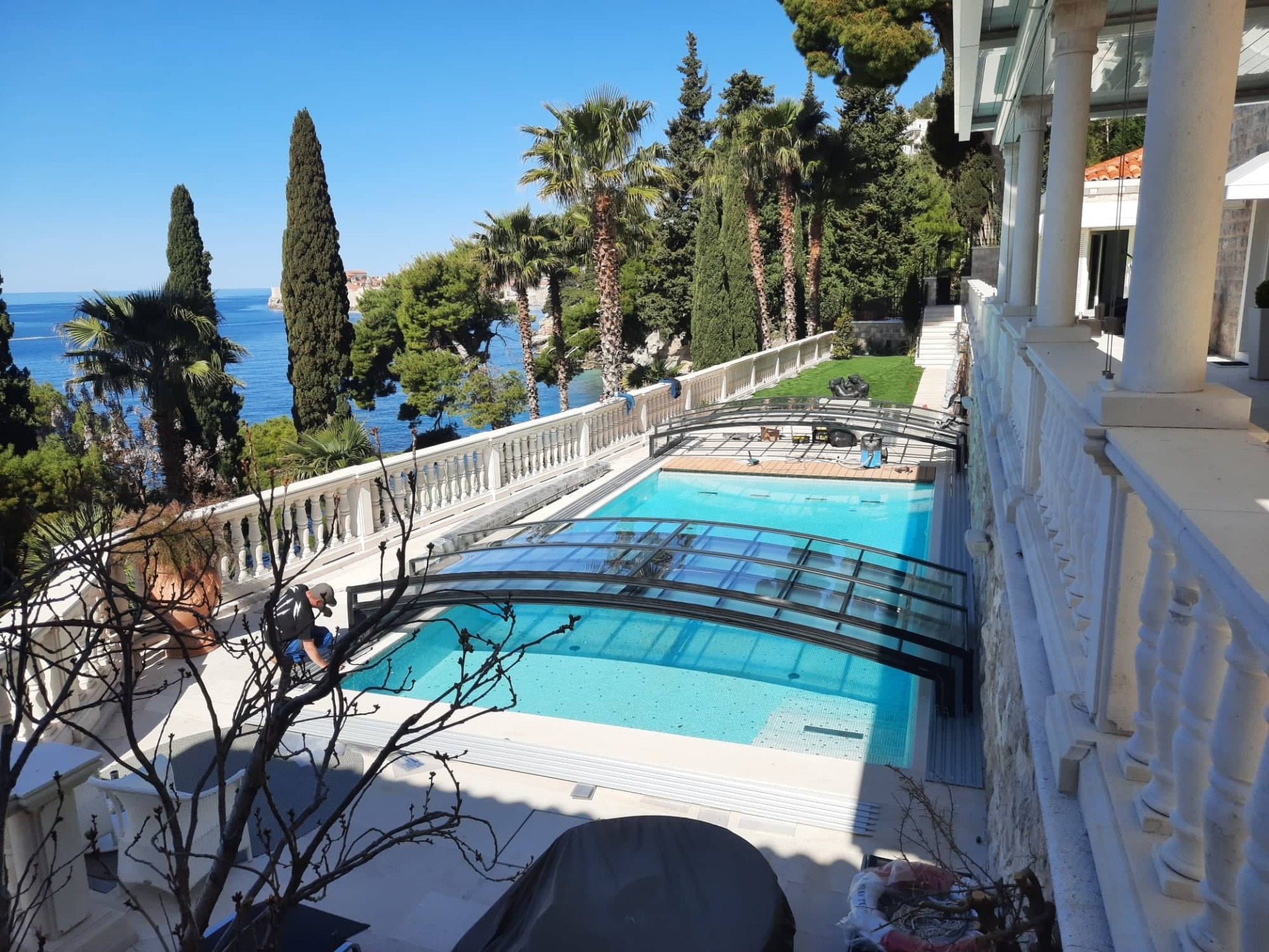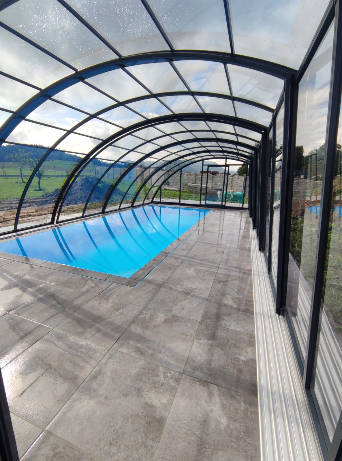Po pokládce bylo instalováno nízké zastřešení NIECA s uzamykatelnými posuvnými dveřmi v nejvyšším segmentu. Na zadním čele bylo nutné udělat sklopný profil z důvodu požadavku na přejezd ventilačních hlavic a revizního otvoru. Jednokolejnicový systém s povrchovou instalací ližiny umožňuje pohodlný vstup do bazénu.