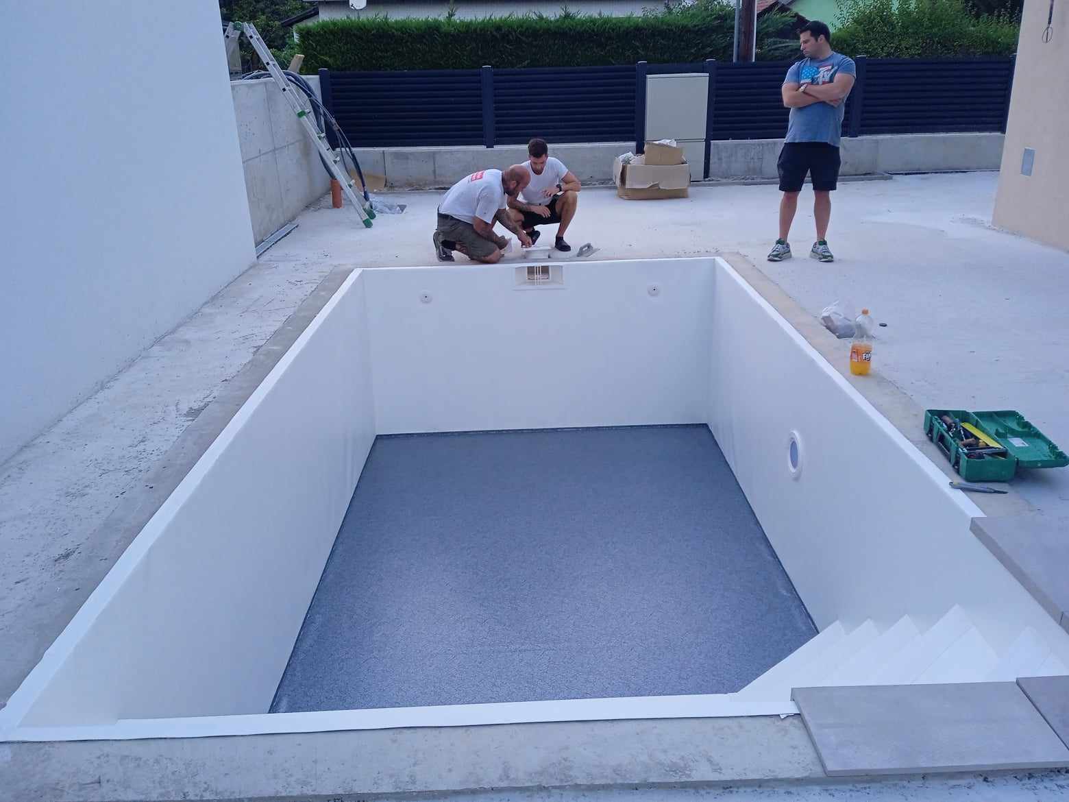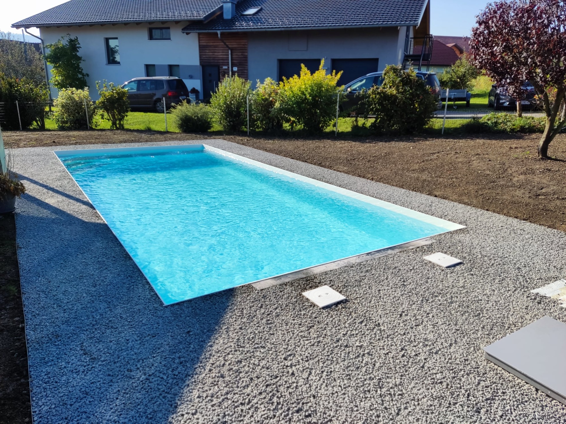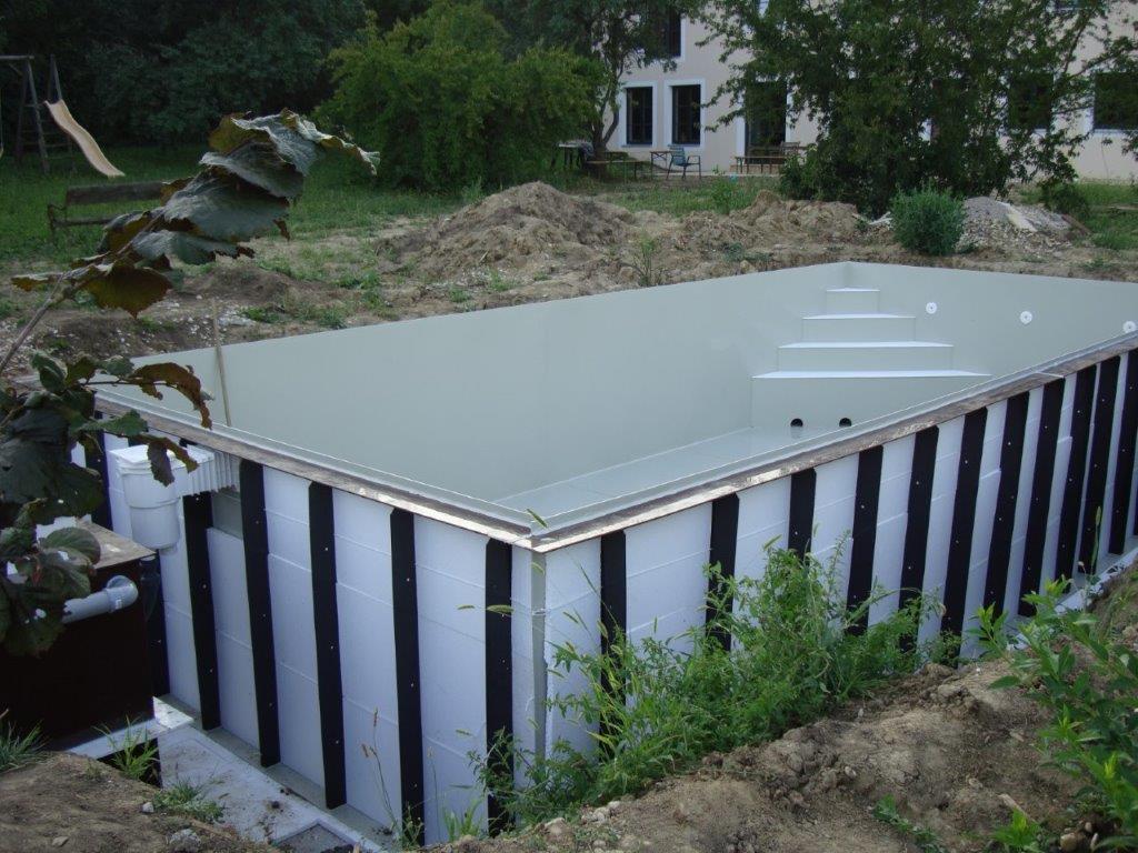 V rakouském městě Leoben jsme realizovali polypropylenový bazén včetně technologie. Nebylo by na tom nic zvláštního, až na to, že jsme jej celý zkompletovali u zákazníka a to včetně šachty a instalací. Důvodem byly místní komplikované podmínky. Pozemek je situován v horské oblasti, kam by bylo velmi obtížné a ekonomicky náročné dopravit bazén v celku. S majitelem jsme se dohodli na kompletaci na místě, která je z důvodu prašného prostředí stavby pro svařování nevhodná, časově náročná a realizujeme ji pouze v krajních případech jako jsou tyto. Šedý bazén se rohovým schodištěm PIZZA má bílé protiskluzy na nášlapech. Jedná se o skimmerový typ. Úprava vody je zabezpečena za pomoci automatický dávkovačů chlórnanu a kyseliny pro snížení pH umístěných v technologické šachtě na krátké straně.