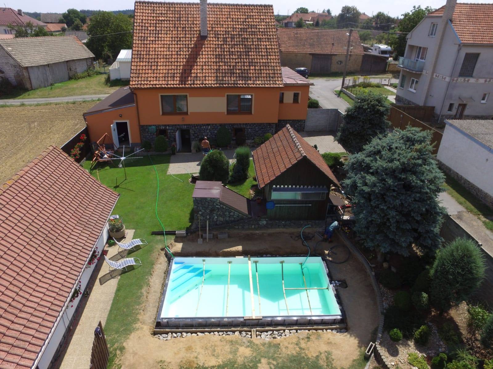 Byla to shoda náhod. Rodičům dělali vyfóliování staré betonové žumpy. Zavolala jsem se, jestli dělají i fóliové bazény. Nakonec jsme skončili u plastového :).