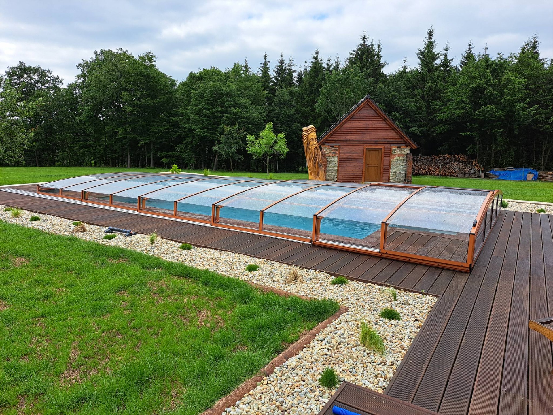 Po pokládce dřevěné terasy následovala realizace jednokolejnicového zastřešení NIECA v přírodní, oranžovo-hnědé barvě konstrukce. Výplň tvoří kouřový polykarbonát plného typu o síle 4 mm. Pěti-segmentové zastřešení je nejnižším modelem pod kterým je stále možné plavat.