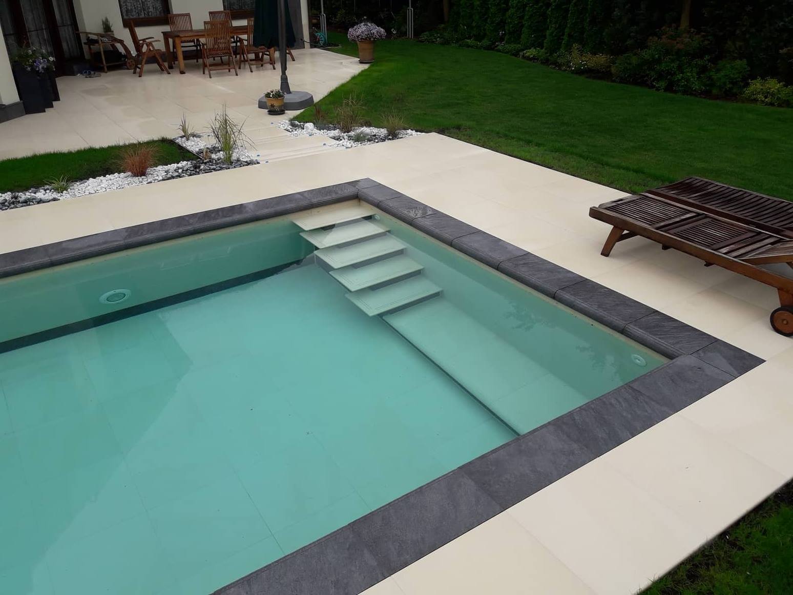 Obdélníkový, antracitový bazén z těžké 3D fólie s přelivným žlábkem INVISIBLIS včetně stavebních prací v rakouském Schladmingu. Vana je osazena rohovým schodištěm FERRARA s lavicí 600 mm s nášlapy a čely v barvě bazénu. Dále se zde nachází dvě bílá LED světla s dálkovým ovládáním v telefonu, filtrační trysky a dnová výpust. Technologie je umístěna v podzemní šachtě vedle bazénu.