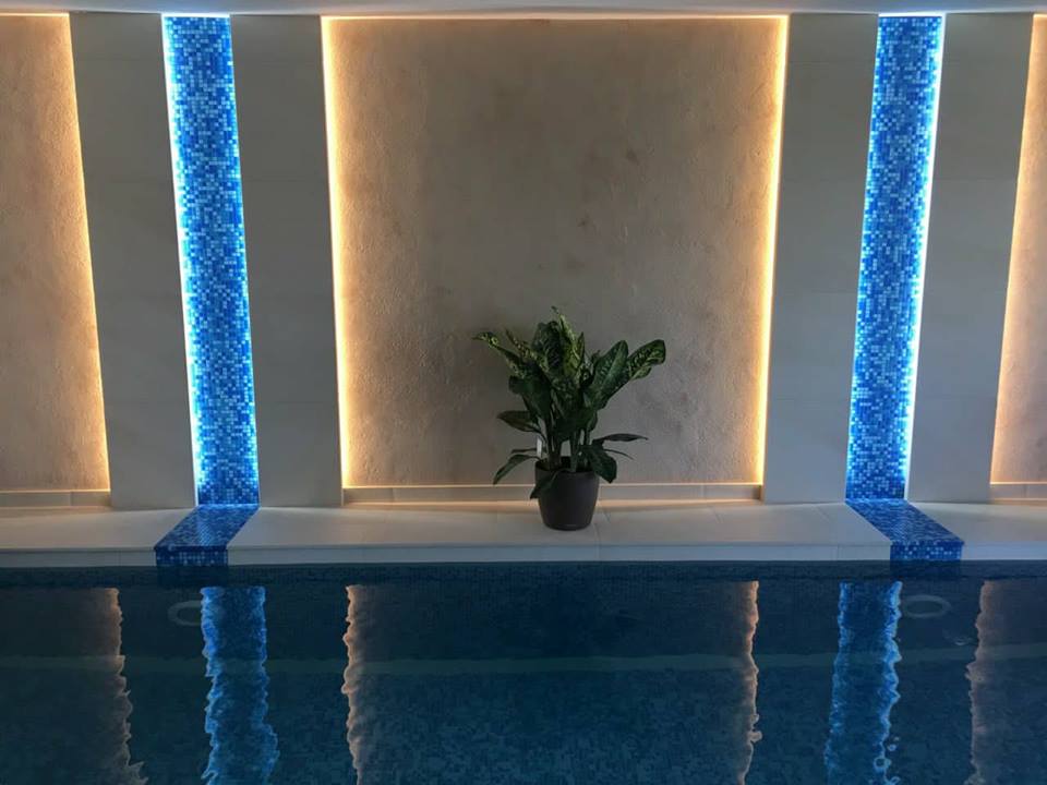 Rekonstrukce původní fóliové vany formou mozaikového obkladu byla realizována v Olomouci. Skimmerová vana se dvěma světly, filtračními tryskami a protiproudem má integrované schodiště PIZZA s nášlapy z dvoucentimetrové italské keramiky, která byla položena po obvodu vany a využita pro bazénový lem i okolní dlažbu. Dlaždice písčité barvy byly využity i na obložení dekoračních prvků s osvětlením formou neviditelných LED pásků. Písčitá barva dobře koresponduje se zvolenou modrou mozaikou. Z důvodu minimalizace odparu byla instalována dodatečně nadzemní roleta a odvlhčovací jednotka. Úpravna vody je umístěna v dobře přístupné technické místnosti.