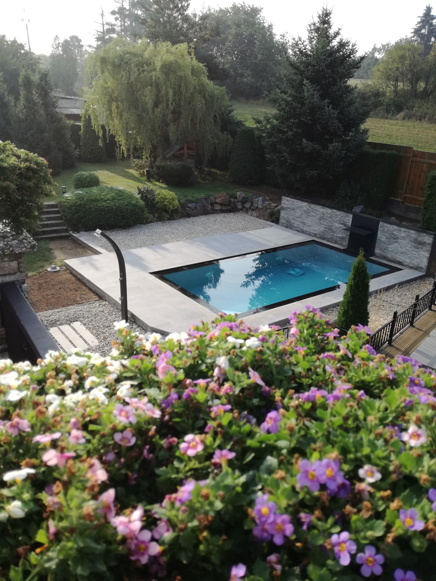 Na bazén byla instalována automatická pojízdná terasa s WPC obkladem typu šedý kámen. Pojezd je realizován do dlouhé strany na dálkové ovládání v telefonu. Terasa designovaná jako relaxační zóna. Nachází se na ni lehátka a křesla. Nerezové kolejnice jsou umístěny nad terénem.
