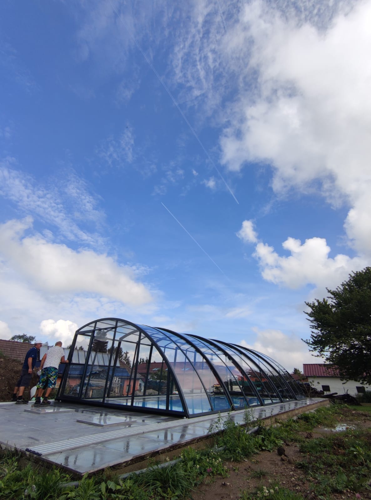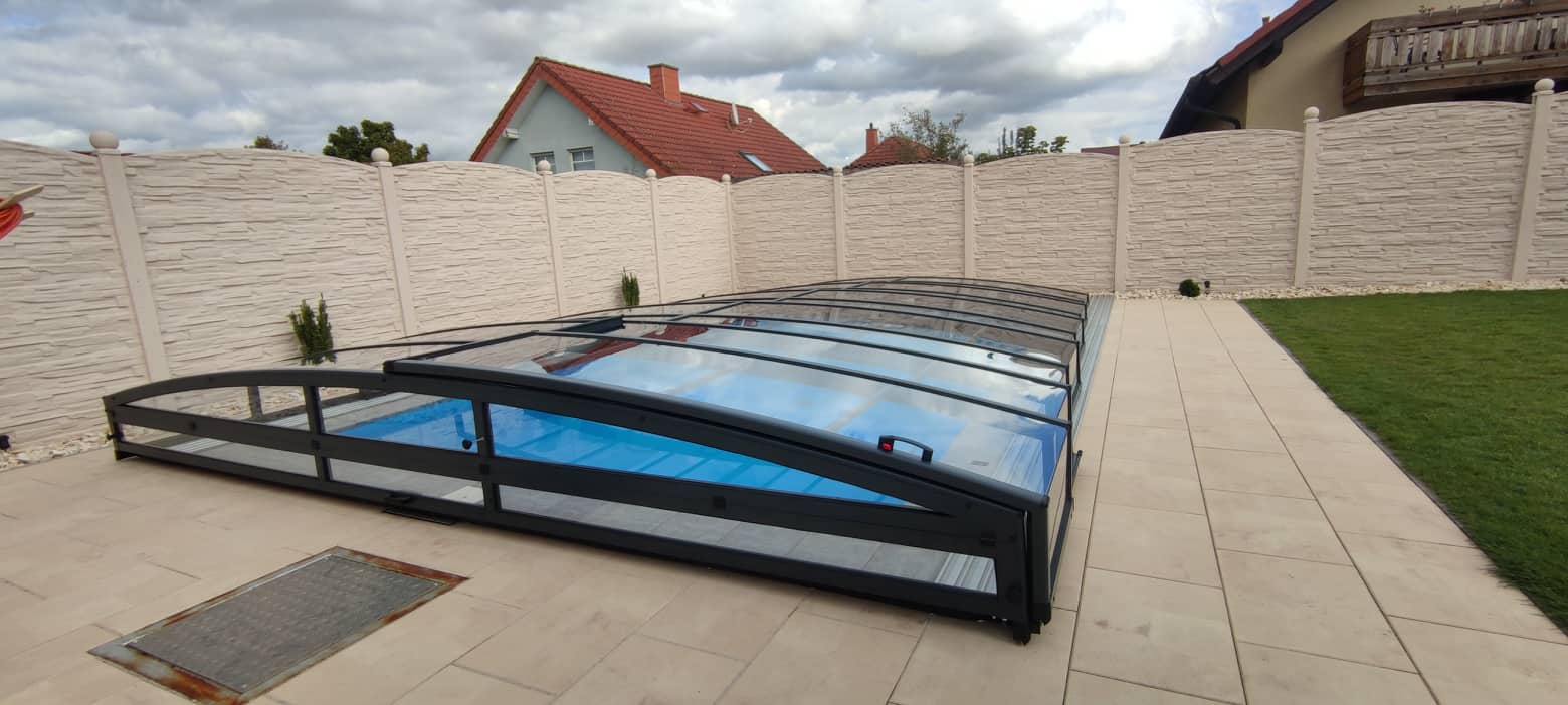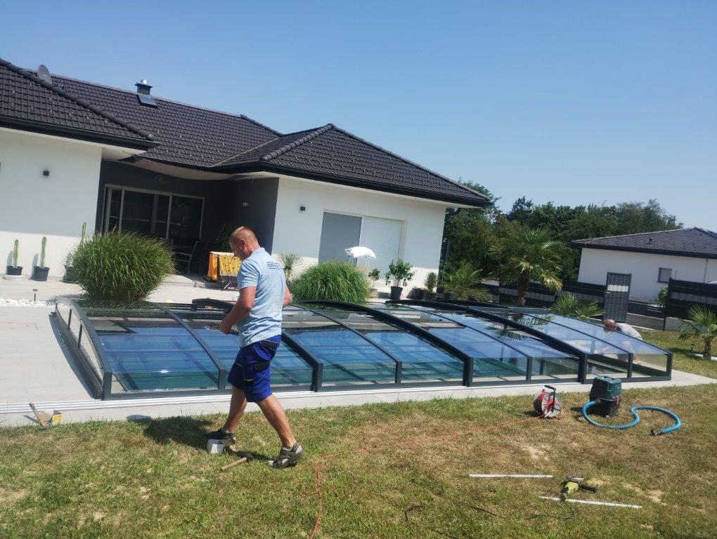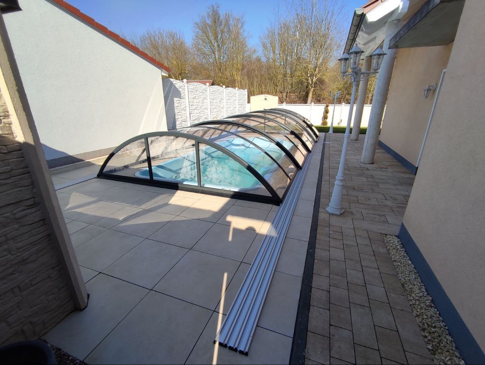 Po pokládce bylo instalováno nízké zastřešení NIECA s uzamykatelnými posuvnými dveřmi v nejvyšším segmentu. Na zadním čele bylo nutné udělat sklopný profil z důvodu požadavku na přejezd ventilačních hlavic a revizního otvoru. Jednokolejnicový systém s povrchovou instalací ližiny umožňuje pohodlný vstup do bazénu.