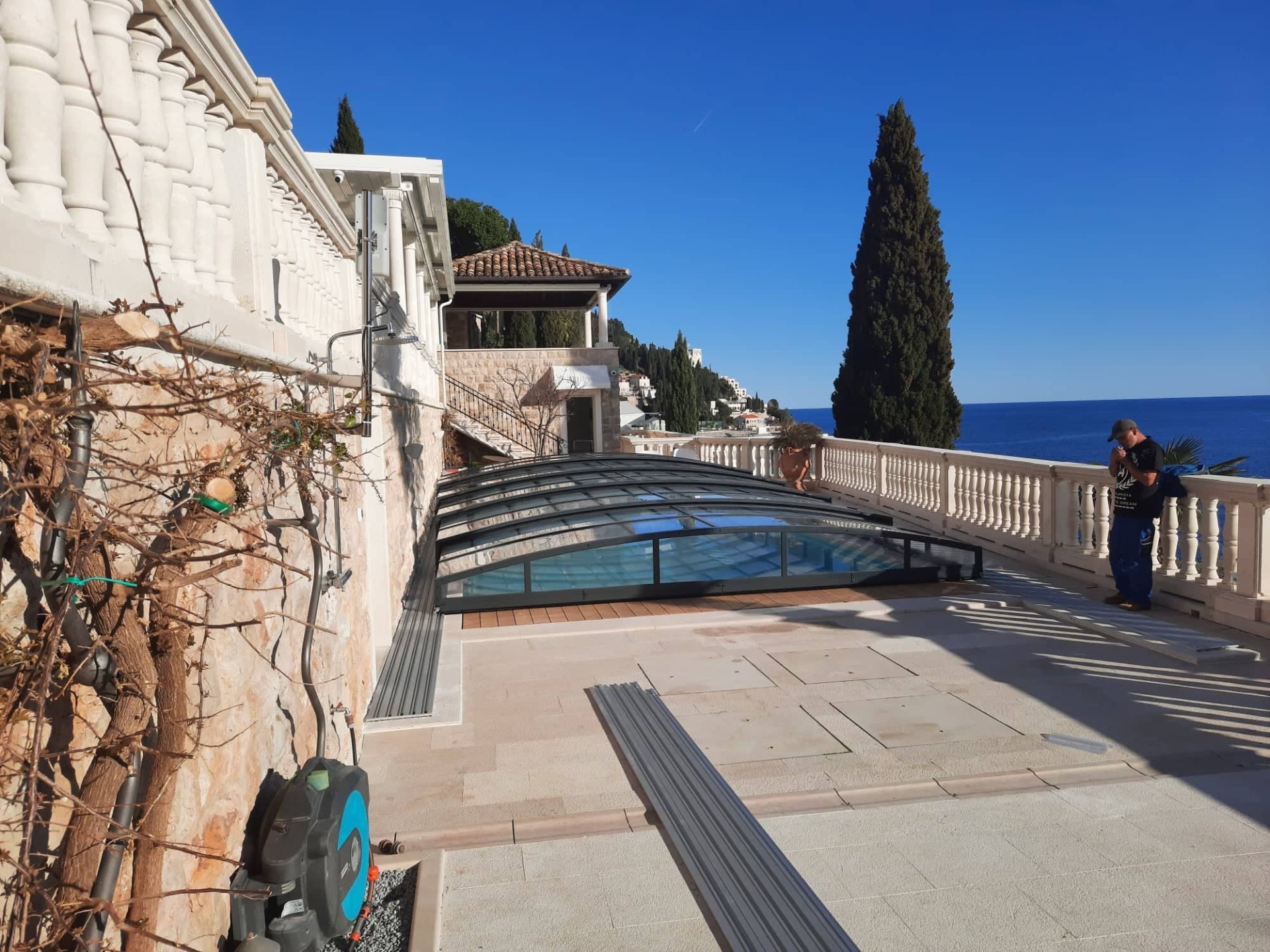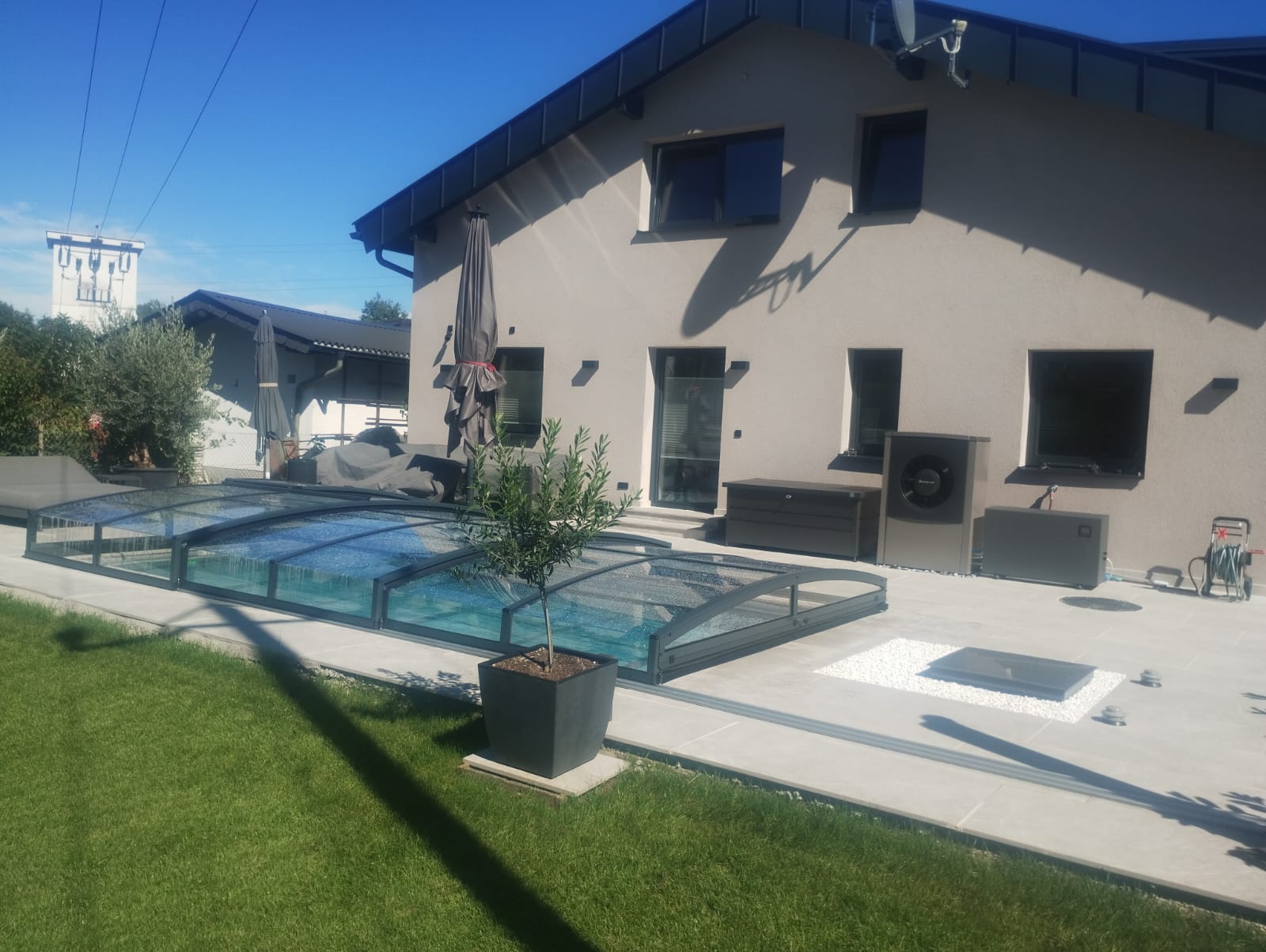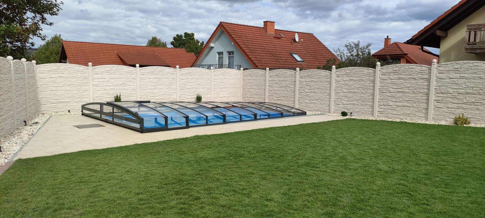 Po pokládce bylo instalováno nízké zastřešení NIECA s uzamykatelnými posuvnými dveřmi v nejvyšším segmentu. Na zadním čele bylo nutné udělat sklopný profil z důvodu požadavku na přejezd ventilačních hlavic a revizního otvoru. Jednokolejnicový systém s povrchovou instalací ližiny umožňuje pohodlný vstup do bazénu.