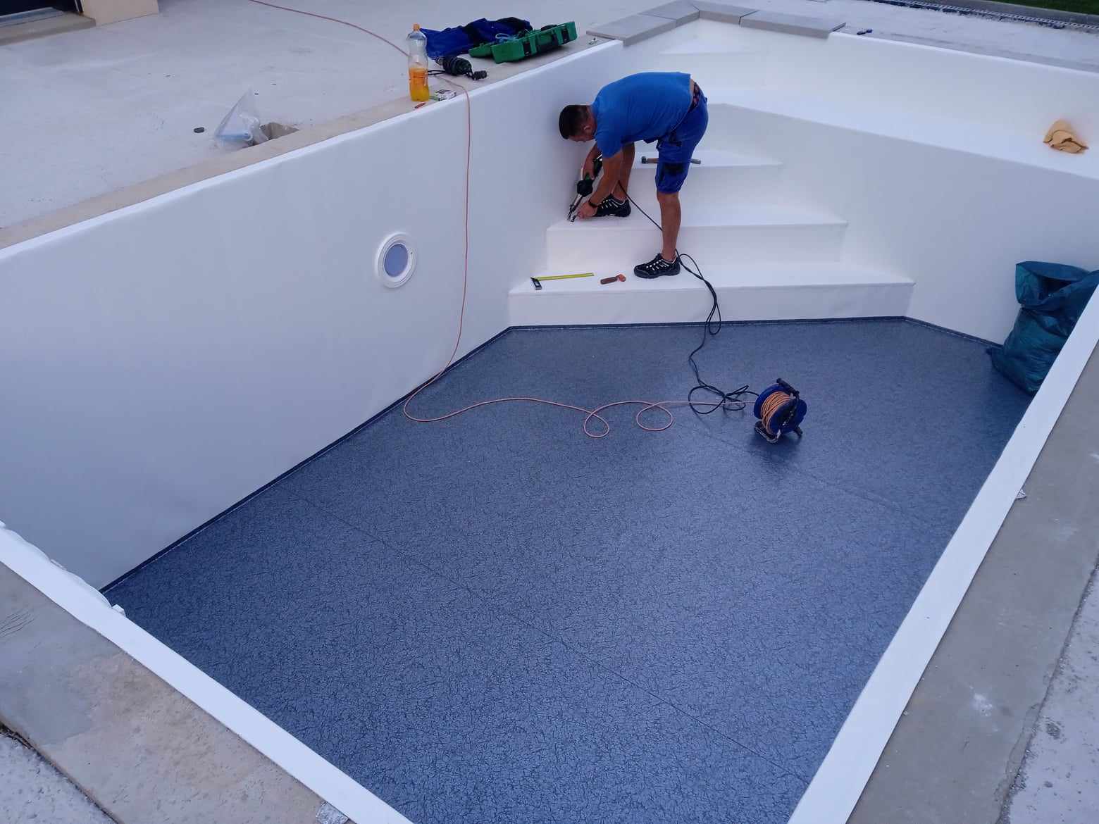 Vyfóliování bazénu z betonového ztraceného bednění s rozdílnou fólií na dně a stěnách v rakouském Strashoffu. Tmavší fólií na dně si zvolil zákazník z důvodu požadavku na snížení údržbovosti dna, které je na nečistoty zatíženo nejvíce. Bazén je osazen jedním světlem, rohovým schodištěm PIZZA s lavicí 700 mm šíře. Dále se na stěnách nachází filtrační trysky, skimmer a dnová výpust ve standardní bílé barvě.