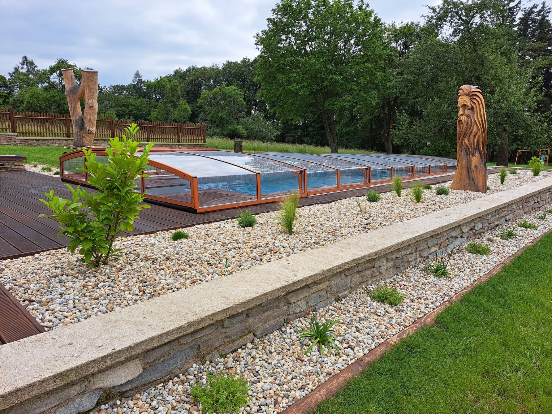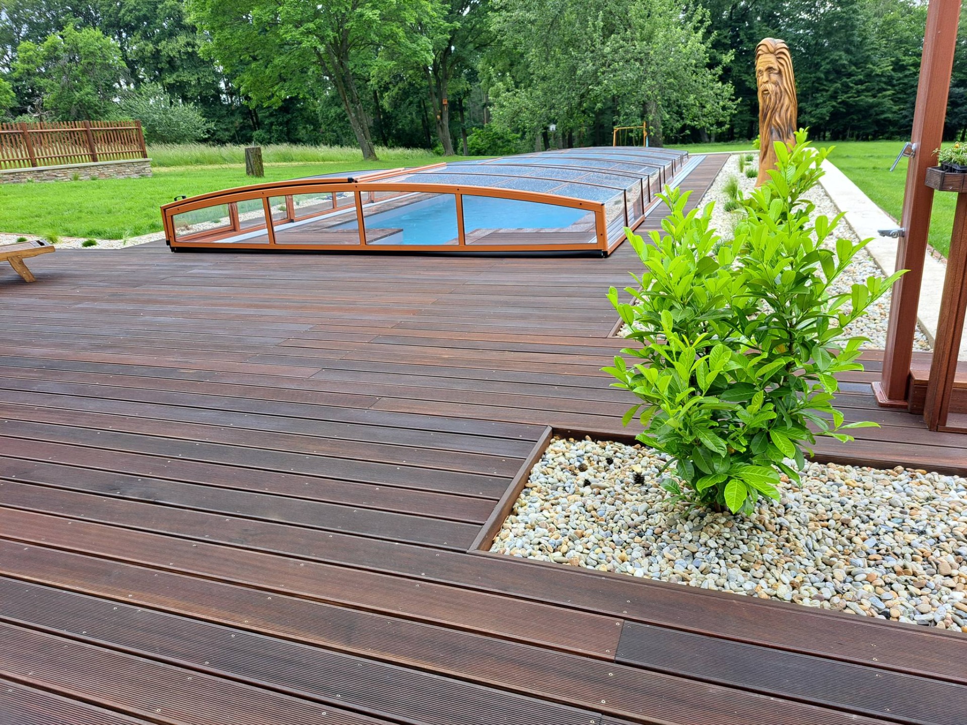 Po pokládce dřevěné terasy následovala realizace jednokolejnicového zastřešení NIECA v přírodní, oranžovo-hnědé barvě konstrukce. Výplň tvoří kouřový polykarbonát plného typu o síle 4 mm. Pěti-segmentové zastřešení je nejnižším modelem pod kterým je stále možné plavat.