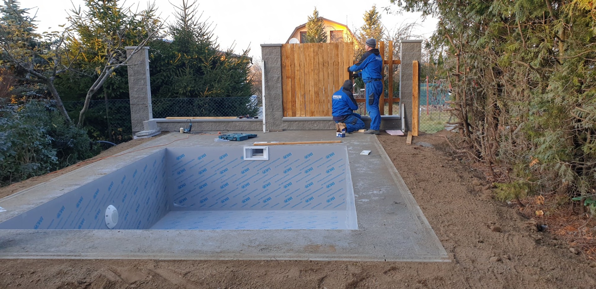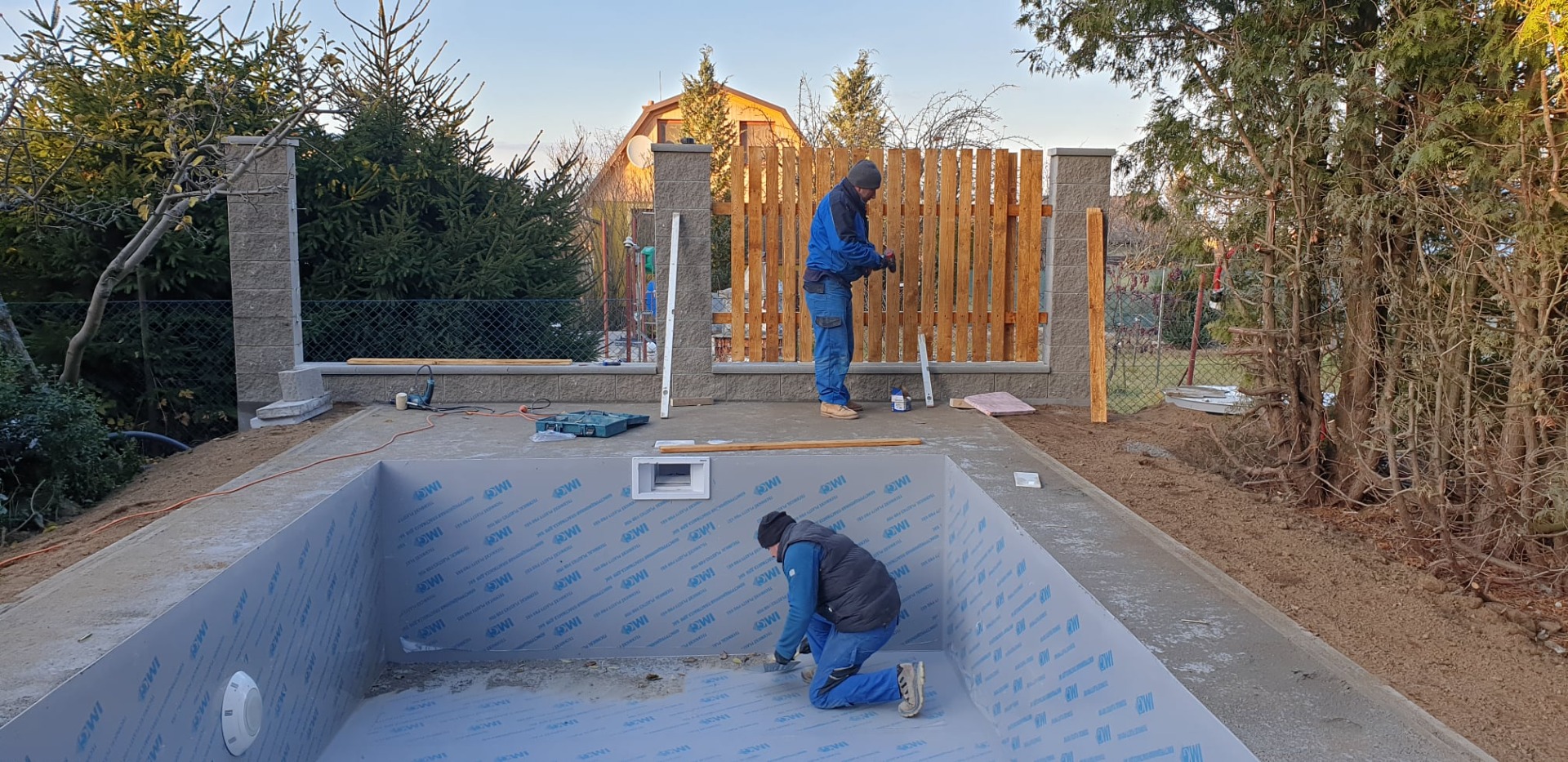 Rekonstrukce malého betonového bazénku formou plastové vany byla realizována v jihočeském Písku. Nejdříve byla přizpůsobena původní betonová vana pro rozměry vložky o velikosti 4 x 3 x 1,2 m. Následně bylo vyrovnáno a zaizolováno dno formou XPS. Vana byla na rozdíl od původního betonového bazénu zapuštěna a osazena betonovým lemem včetně okolní betonové dlažby. Zákazník měl požadavek i na betonový plot s dřevěnou výplní, který jsme realizovali zároveň s pokládkou. Zároveň jsme vyměnili i technologii, která však nadále zůstala v původní betonové šachtičce vedle bazénu.
