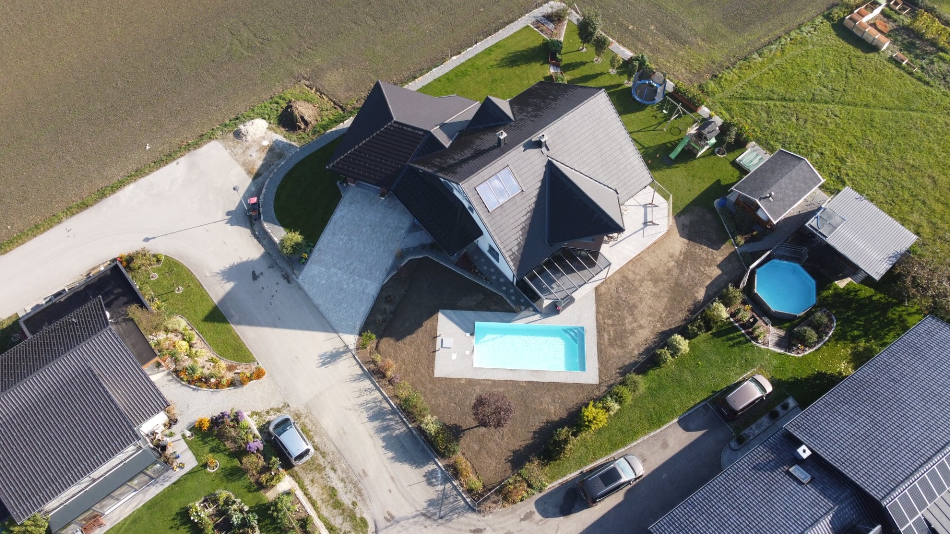Nízké zastřešení NIECA s antracitovou konstrukcí a plným polykarbonátem bylo instalováno ve Slovinské obci Idrija. Zastřešení bylo osazeno klapkou v předním čele z důvodu nuceného parkování nad bazénem v důsledku nedostatku místa na zahradě a rozčleněno na více segmentů pro minimální parkovací plochu. Výplň tvoří čirý polykarbonát síly 4 mm.