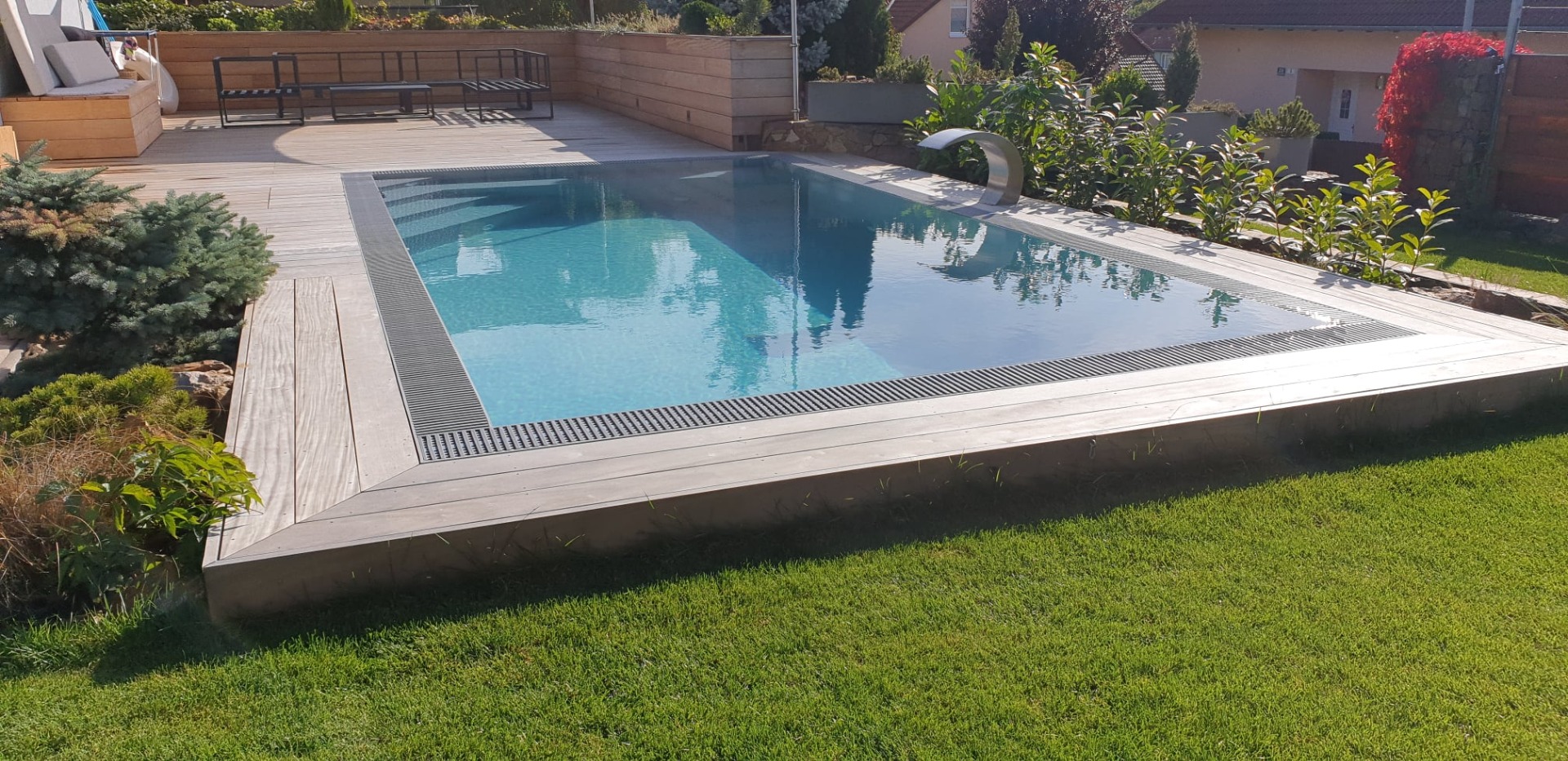 Obdélníkový, antracitový bazén z těžké 3D fólie s přelivným žlábkem INVISIBLIS včetně stavebních prací v rakouském Schladmingu. Vana je osazena rohovým schodištěm FERRARA s lavicí 600 mm s nášlapy a čely v barvě bazénu. Dále se zde nachází dvě bílá LED světla s dálkovým ovládáním v telefonu, filtrační trysky a dnová výpust. Technologie je umístěna v podzemní šachtě vedle bazénu.