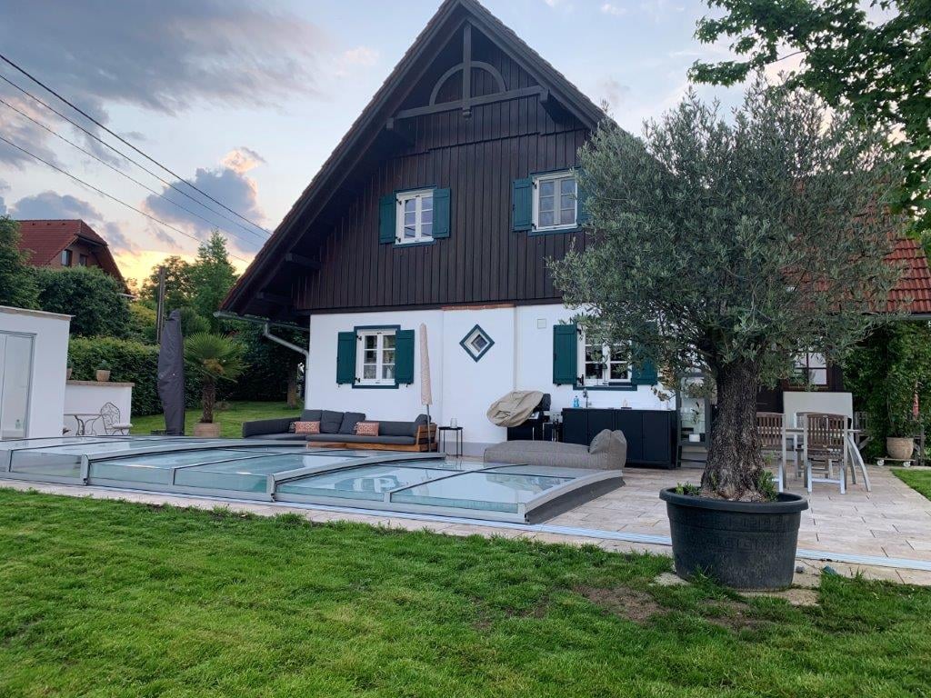 Nízké čtyřsegmentové zastřešení antracitové konstrukce bylo realizováno v rakouském Innsbrucku. Zákazník si zvolil dvoukolejnicový systém s dvojitou aretací. Důvodem je častý výskyt větru o vyšších rychlostech. Vstup do bazénu tvoří jedny posuvné dveře s uzamykáním na klíč. Výplň tvoří čirý polykarbonát síly 4 mm.
