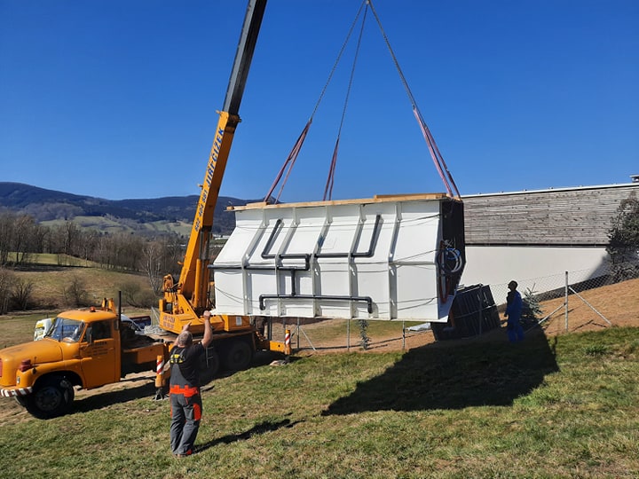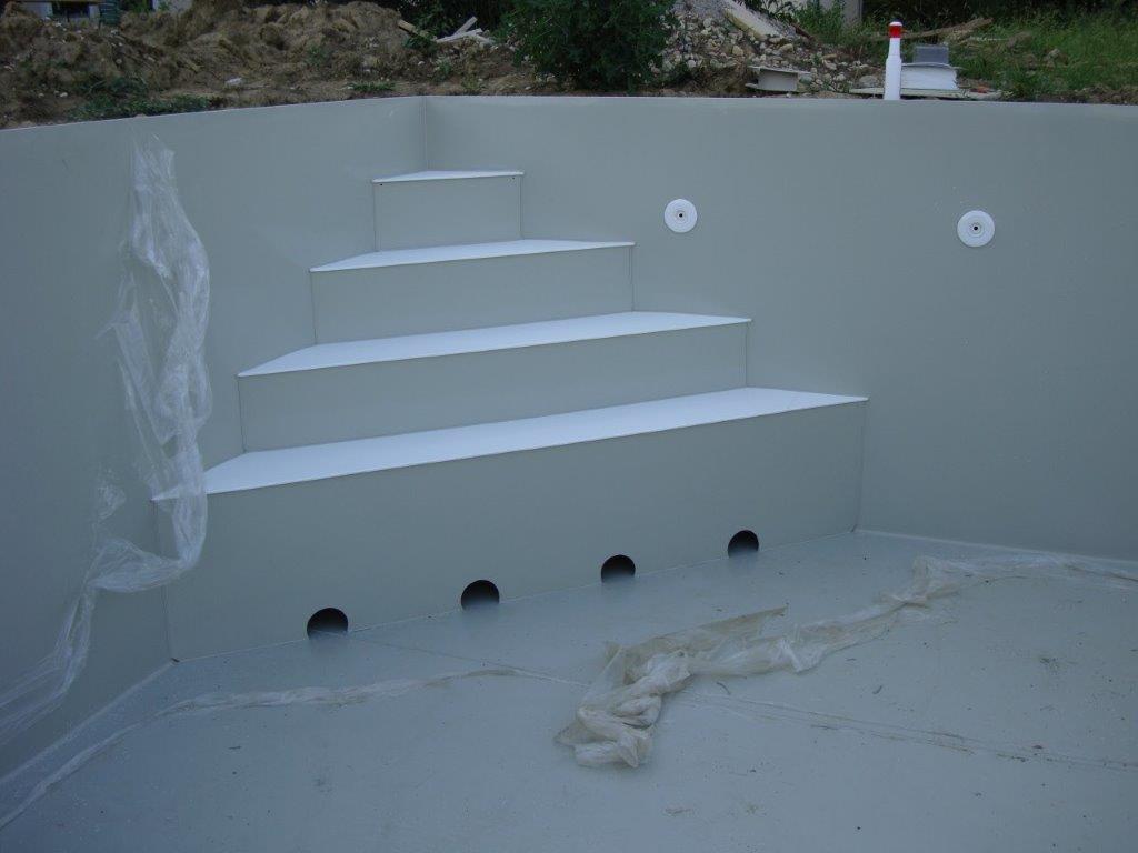 V rakouském městě Leoben jsme realizovali polypropylenový bazén včetně technologie. Nebylo by na tom nic zvláštního, až na to, že jsme jej celý zkompletovali u zákazníka a to včetně šachty a instalací. Důvodem byly místní komplikované podmínky. Pozemek je situován v horské oblasti, kam by bylo velmi obtížné a ekonomicky náročné dopravit bazén v celku. S majitelem jsme se dohodli na kompletaci na místě, která je z důvodu prašného prostředí stavby pro svařování nevhodná, časově náročná a realizujeme ji pouze v krajních případech jako jsou tyto. Šedý bazén se rohovým schodištěm PIZZA má bílé protiskluzy na nášlapech. Jedná se o skimmerový typ. Úprava vody je zabezpečena za pomoci automatický dávkovačů chlórnanu a kyseliny pro snížení pH umístěných v technologické šachtě na krátké straně.