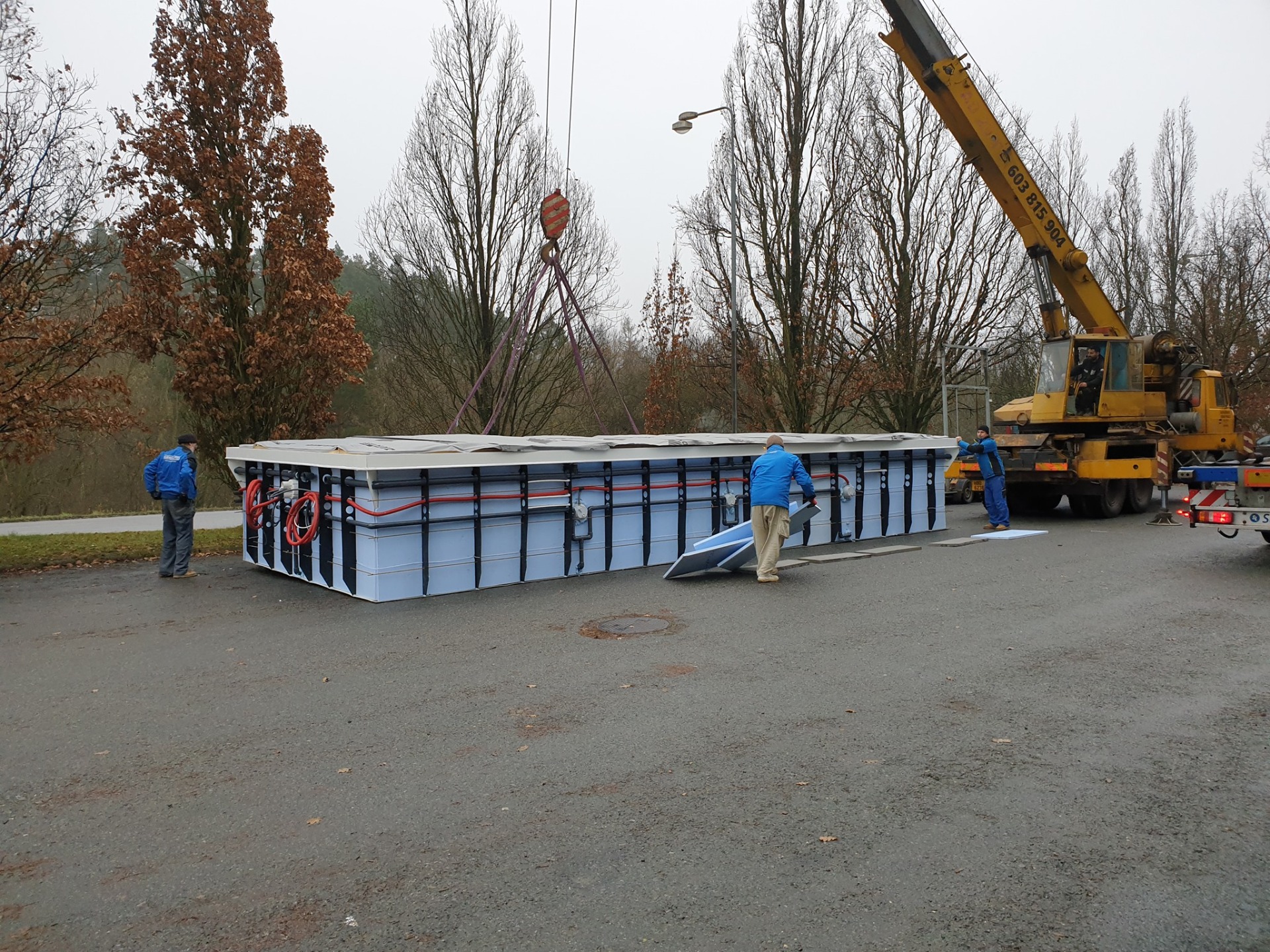 Přelivový bazén typu EASYGRID směřoval od nás přímo do švédské Uppsaly. Bazén je vybaven protiproudem s piezoelektrickým tlačítkem a královským schodištěm s tmavě modrými nášlapy v protiskluzové úpravě. Stěny jsou osazeny filtračními tryskami, dnovou výpustí a čtyřmi LED RGB světly. Dodávku technlogie včetně montáže provedla provedla tamní firma.