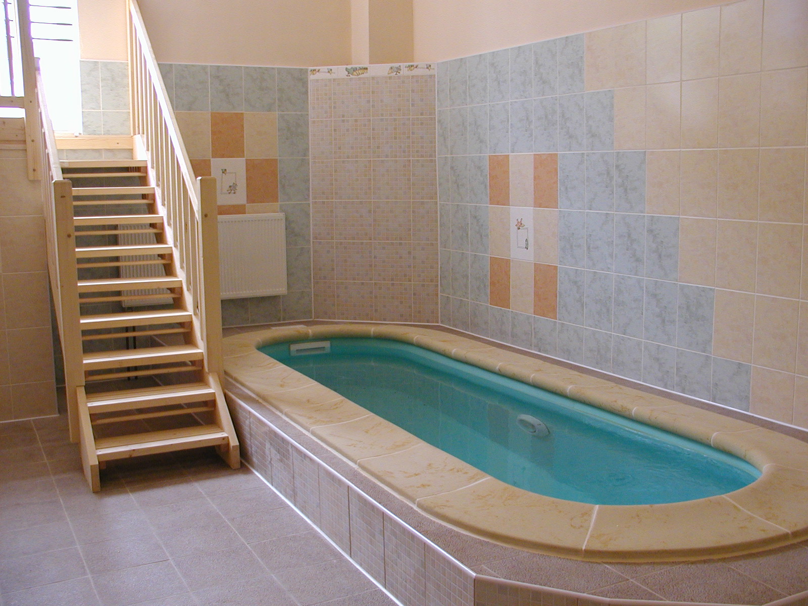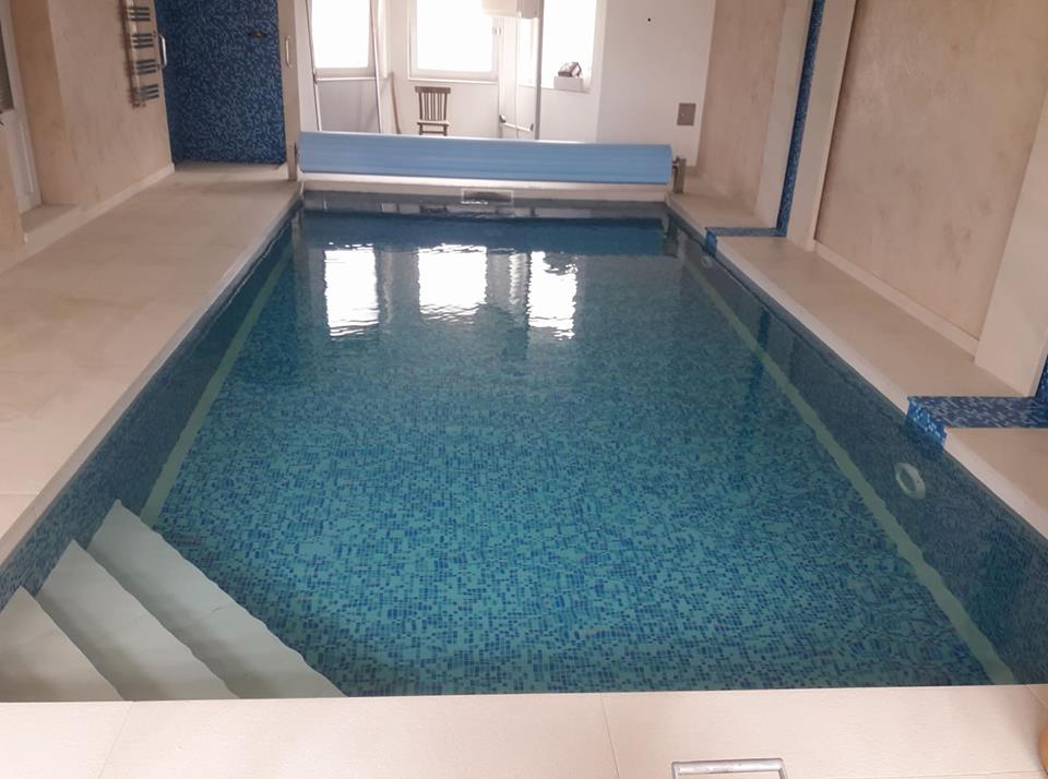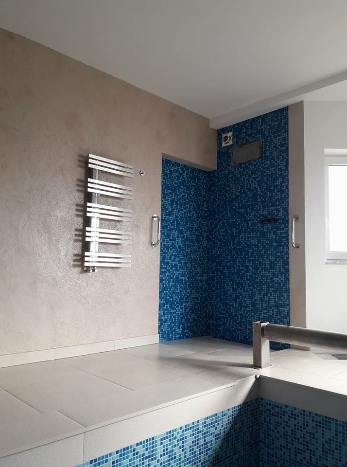 Rekonstrukce původní fóliové vany formou mozaikového obkladu byla realizována v Olomouci. Skimmerová vana se dvěma světly, filtračními tryskami a protiproudem má integrované schodiště PIZZA s nášlapy z dvoucentimetrové italské keramiky, která byla položena po obvodu vany a využita pro bazénový lem i okolní dlažbu. Dlaždice písčité barvy byly využity i na obložení dekoračních prvků s osvětlením formou neviditelných LED pásků. Písčitá barva dobře koresponduje se zvolenou modrou mozaikou. Z důvodu minimalizace odparu byla instalována dodatečně nadzemní roleta a odvlhčovací jednotka. Úpravna vody je umístěna v dobře přístupné technické místnosti.